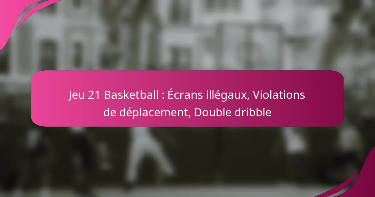 Les violations courantes dans le Game 21 incluent le déplacement, le double dribble et les fautes. Le déplacement se produit lorsqu’un joueur fait trop de pas sans dribbler le ballon, tandis que le double dribble se produit lorsqu’un joueur dribble, s’arrête, puis recommence à dribbler. Ces deux violations entraînent généralement une perte de balle, donnant la possession du ballon au joueur ou à l’équipe adverse.